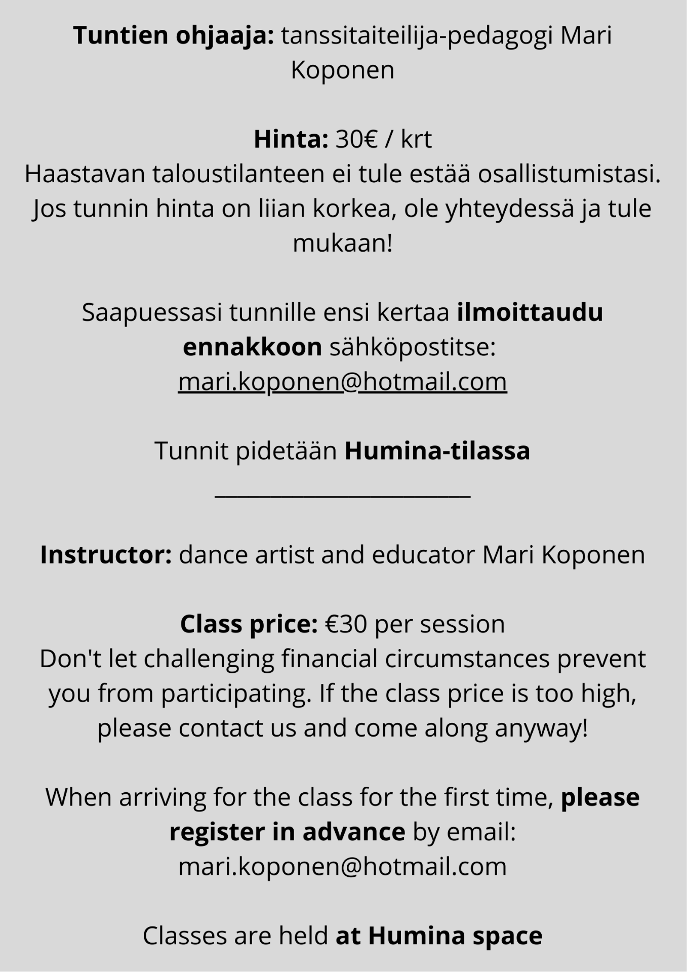The weekly workshop sessions, which focus on energy, consist of exercises based on a selected theme or the energy of the day, exploring movement in different spaces inside and outside the body, sensing oneself and one's environment, and being present together. The aim is to become more sensitive to the sensations and wisdom of your own body, to become more aware of yourself and your environment, and to be in touch with both the deep and the surface, from the energy.